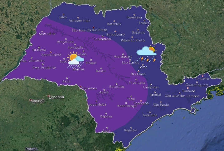 O tempo segue instável em diversas regiões do Estado de São Paulo nesta quinta-feira (19), com previsão de céu parcialmente nublado a nublado e ocorrência de chuvas isoladas, algumas acompanhadas de trovoadas, entre o período da tarde e início da noite.