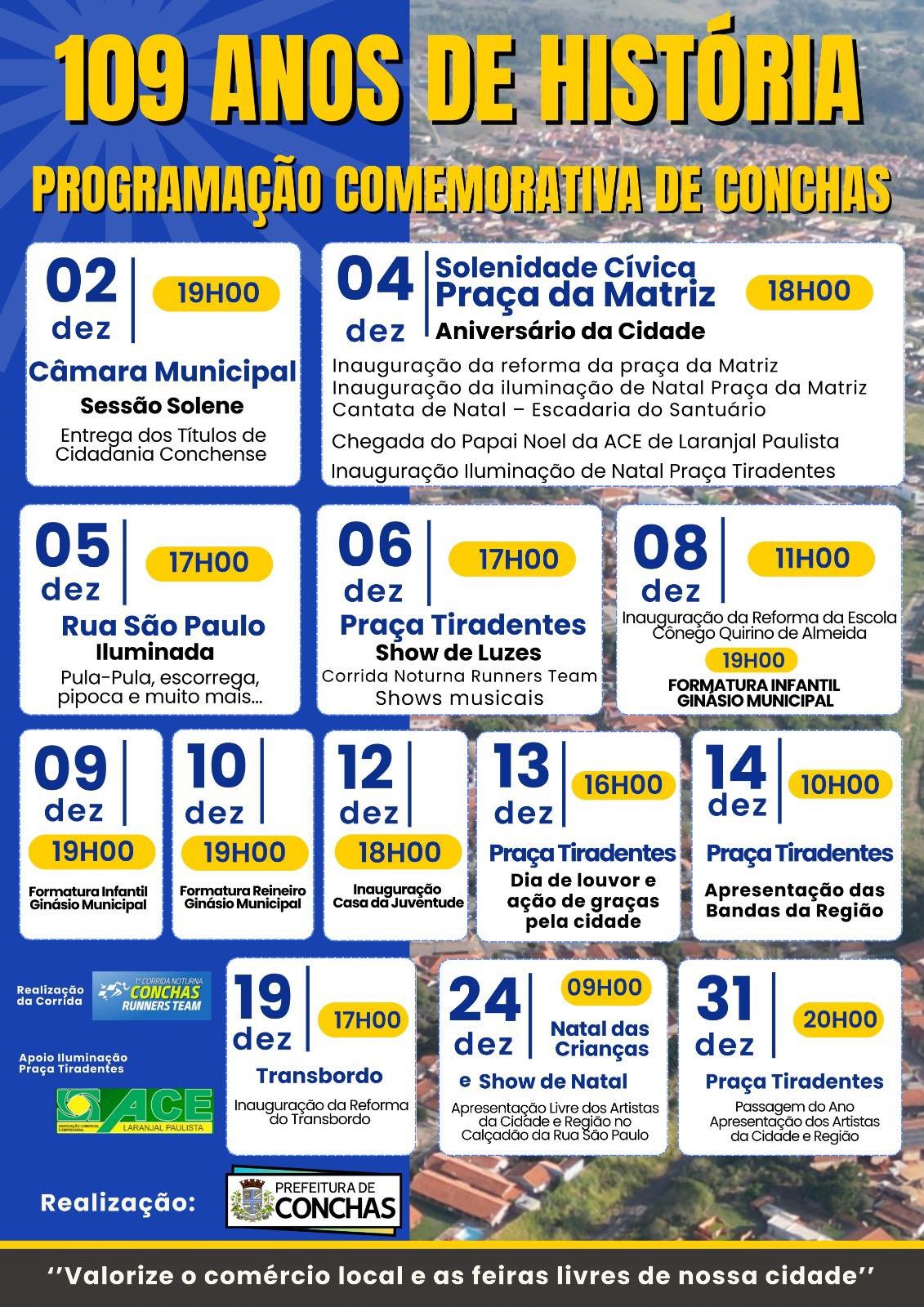 O município de Conchas inicia, a partir do dia 2 de dezembro, uma programação especial para comemorar seus 109 anos de história. As atividades se estendem até 31 de dezembro e prometem envolver toda a comunidade em momentos de celebração, cultura, fé e convivência familiar.