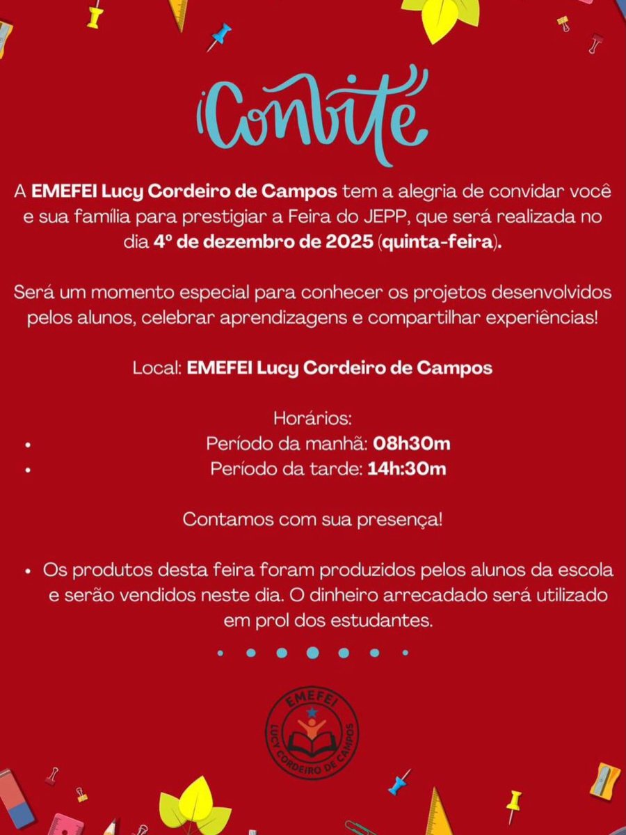 Para mais informações sobre o evento, entre em contato diretamente com a EMEFÉI Lucy Cordeiro de Campos.